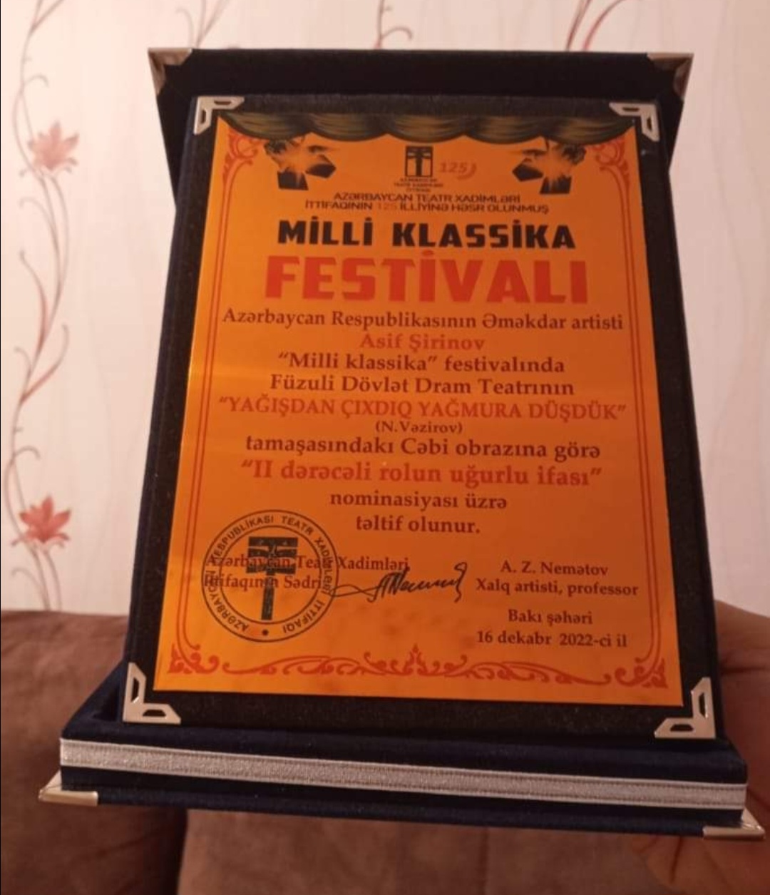 Teatrın baş rejissoru, Azərbaycan Respublikasının Əməkdar artisti Asif Şirinov tamaşada Cəbi obrazına görə 2-ci dərəcəli rolun uğurlu ifası nominasiyası üzrə təltif olunub.
