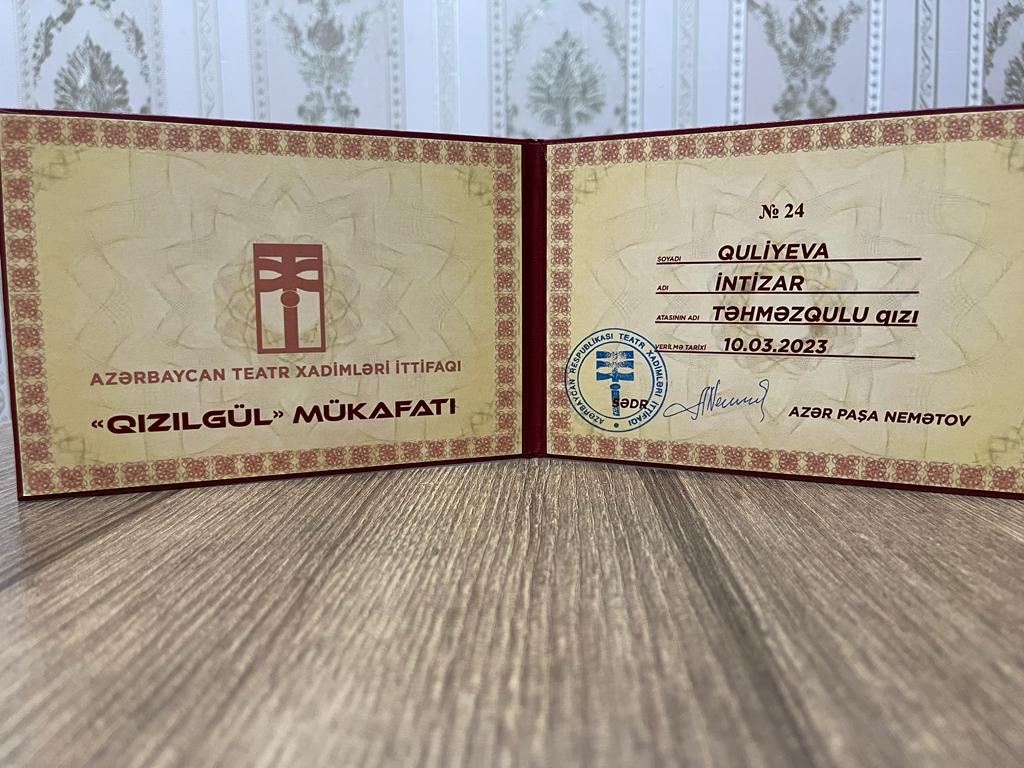 Teatrın ali dərəcəli aktrisası İntizar Quliyeva isə "Qızılgül"mükafatına layiq görülüb.
