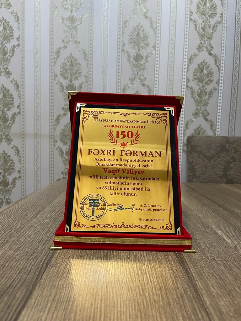 Füzuli Dövlət Dram Teatrının direktoru, Əməkdar mədəniyyət işçisi Vaqif Vəliyev Azərbaycan Teatr Xadimlər İttifaqı tərəfindən peşəkar milli teatrın yaradılmasının 150 illiyi və teatr sənətinin inkişafındakı xidmətlərinə görə, Fəxri fərmanla təltif olunub.