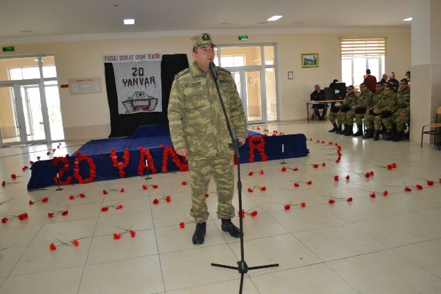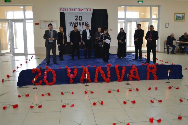 Füzuli Dövlət Dram Teatrı 20 Yanvar Faciəsinin 28-ci il dönümü ilə əlaqədar "Şəhidlər ölməz” adlı poetik xalq faciəsini Ağcabədi, Beyləqan və Füzuli rayonlarında yerləşən "N” saylı hərbi hissənin şəxsi heyəti qarşısında nümayişə start verib.